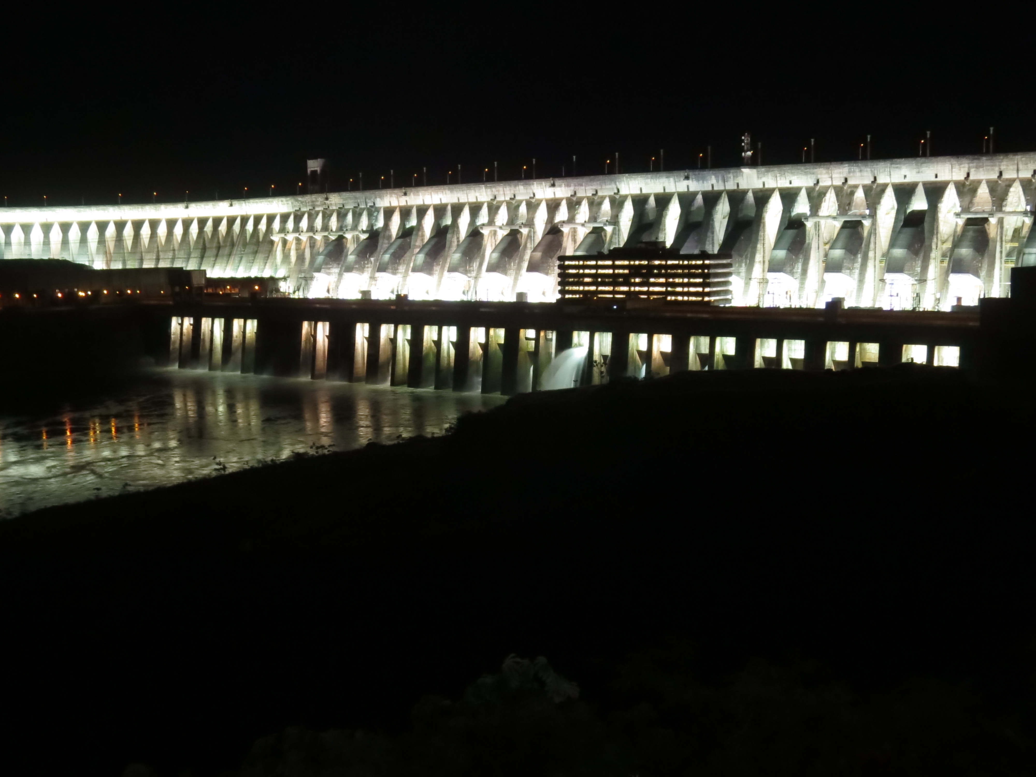 On the Paraguayan side of the tri-border area (Argentina and Brazil) where you visit the Iguazu Falls, the main attraction is the Itaipu Dam. This dam was the largest in the world, until the Chinese built Three Gorges just recently. It provides over 80% of all of Paraguay’s electricity and about 15% of Brazil’s. In reading the brochures at the hotel, I discovered that the dam offered not only tours, but also a nighttime illumination show on Fridays and Saturdays. We happened to arrive on a Thursday afternoon, so I thought, we can do both, right? The only site to see, might as well. The hostel receptionist convinced us it would be best to do the tour that day and the lights the next night. We set out on a local bus and arrived about 45 minutes later. They information center sent us to an auditorium where we watched two 10 minute videos on the dam in Spanish, most of it above our heads. Then we got on a bus with the other visitors and went to see the dam. It spans the river between Paraguay and Brazil and thus, after crossing the Brazilian border earlier that morning, we crossed again, with no controls (again), to see the dam from both sides, before heading back to town in the local bus.